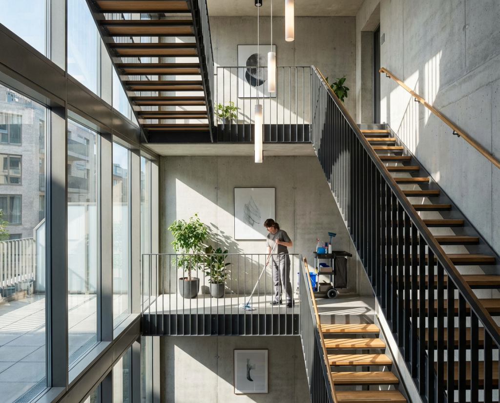 Unsere Treppenhausreinigung stellt sicher, dass Eingangsbereiche, Treppen, Geländer und Gemeinschaftsflächen stets sauber und sicher sind.